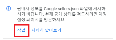 2. 모바일용) 사진과 같이 '판매자 정보를 Google sellers.json 파일에 게시하기 바랍니다.'라는 문구의 경고문이 보인다면 아래의 '작업'버튼을 눌러주세요
