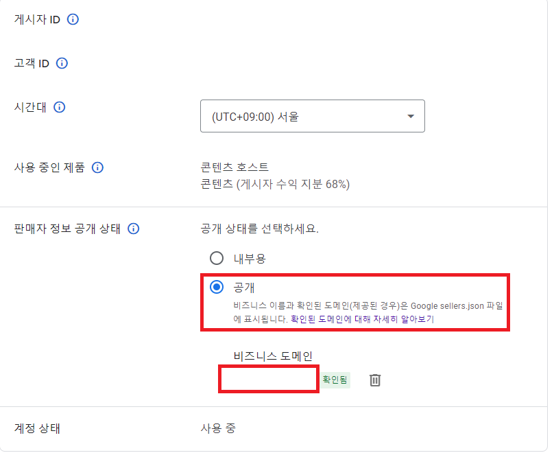 공개 밑의 비즈니스 도메인(빨간 체크박스)에 방문자분들께서 '애드센스 승인을 얻은 도메인 주소'를 입력해 주시면 작업이 끝납니다! 이 모든 작업을 다 하셨으면 새로고침(F5) 버튼을 눌러 그동안 했던 작업들이 잘 되었는지 확인 후 시간이 지나면 문제가 해결될 것입니다!