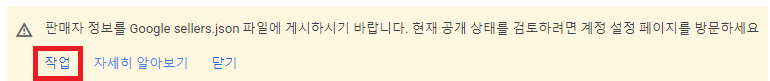3. pc용) 사진과 같이 '판매자 정보를 Google sellers.json 파일에 게시하기 바랍니다.'라는 문구의 경고문이 보인다면 아래의 '작업'버튼을 눌러주세요